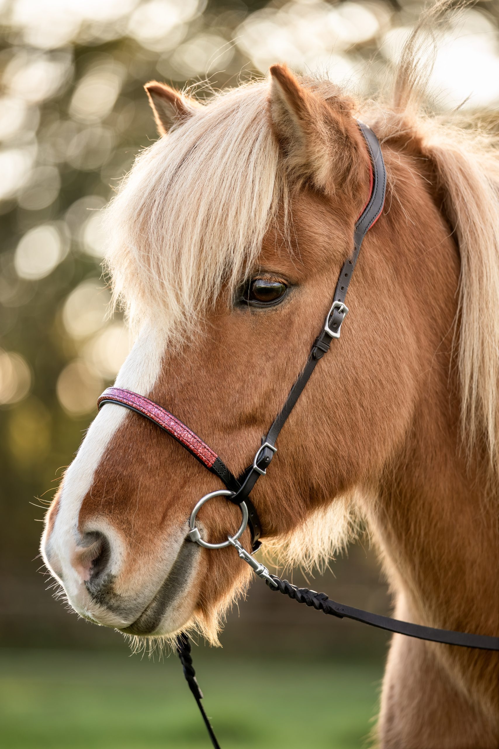 Wunderschöne, komplette Trense Myvatn aus schwarzem Leder. Am Nasenriemen ist Fischleder in rot mit weißen und blau metallic Sprenkeln verarbeitet. Das Polster am Genickriemen ist rot. Die Schnallen sind aus Edelstahl.