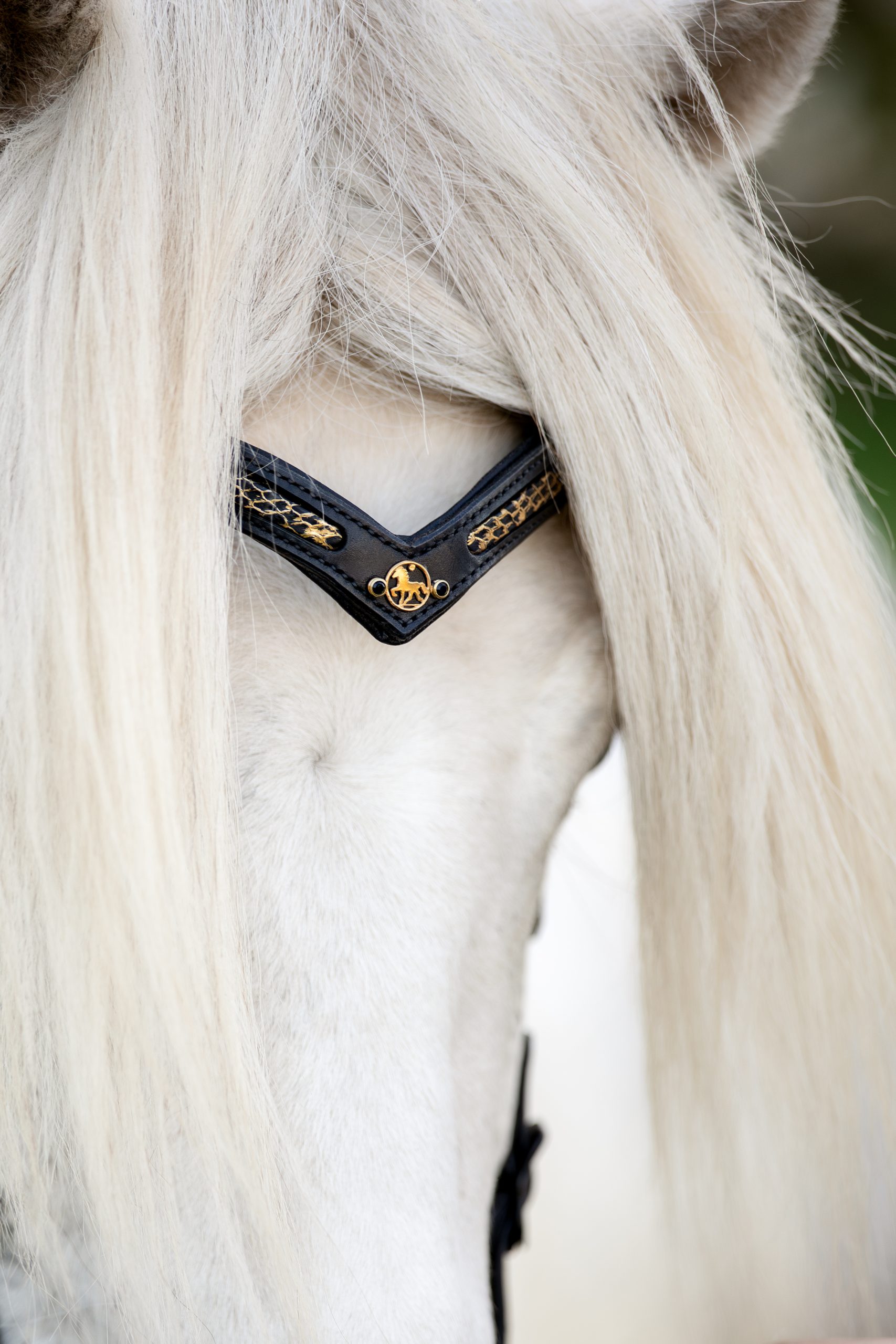 Schmuckstück von Fine Fellows, wird mit 2 kleinen Strass-Nieten nach Wahl auf dem Nasen-/Stirnriemen befestigt.